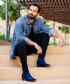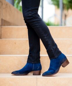 Bota elaborada completamente a mano, corte gamuza color azul, forro de piel y suela sintética. El tacón tiene una altura de 5.5 cm.