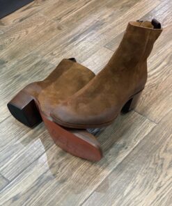 Bota elaborada completamente a mano, corte gamuza color tabaco, forro de piel y suela de cuero. El tacón tiene una altura de 5.5 cm.