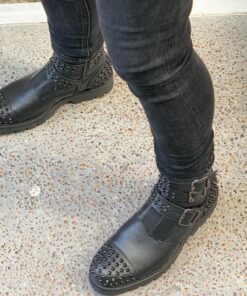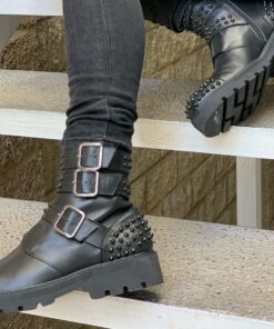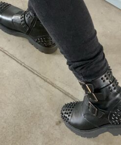 Bota de 3 hebillas elaborada 100% a mano con corte piel color negro con estoperoles, forro de piel, suela sintética ultra ligera.