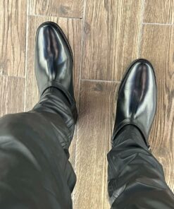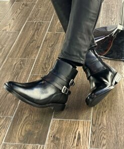 Calzado elaborado 100% a mano, corte piel negro con 2 látigos, forro de piel y suela sintética.