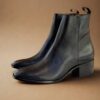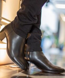 Bota elaborada completamente a mano, corte piel color negro, forro de piel, suela y tacón de cuero natural. El tacón tiene una altura de 5.5 cm.