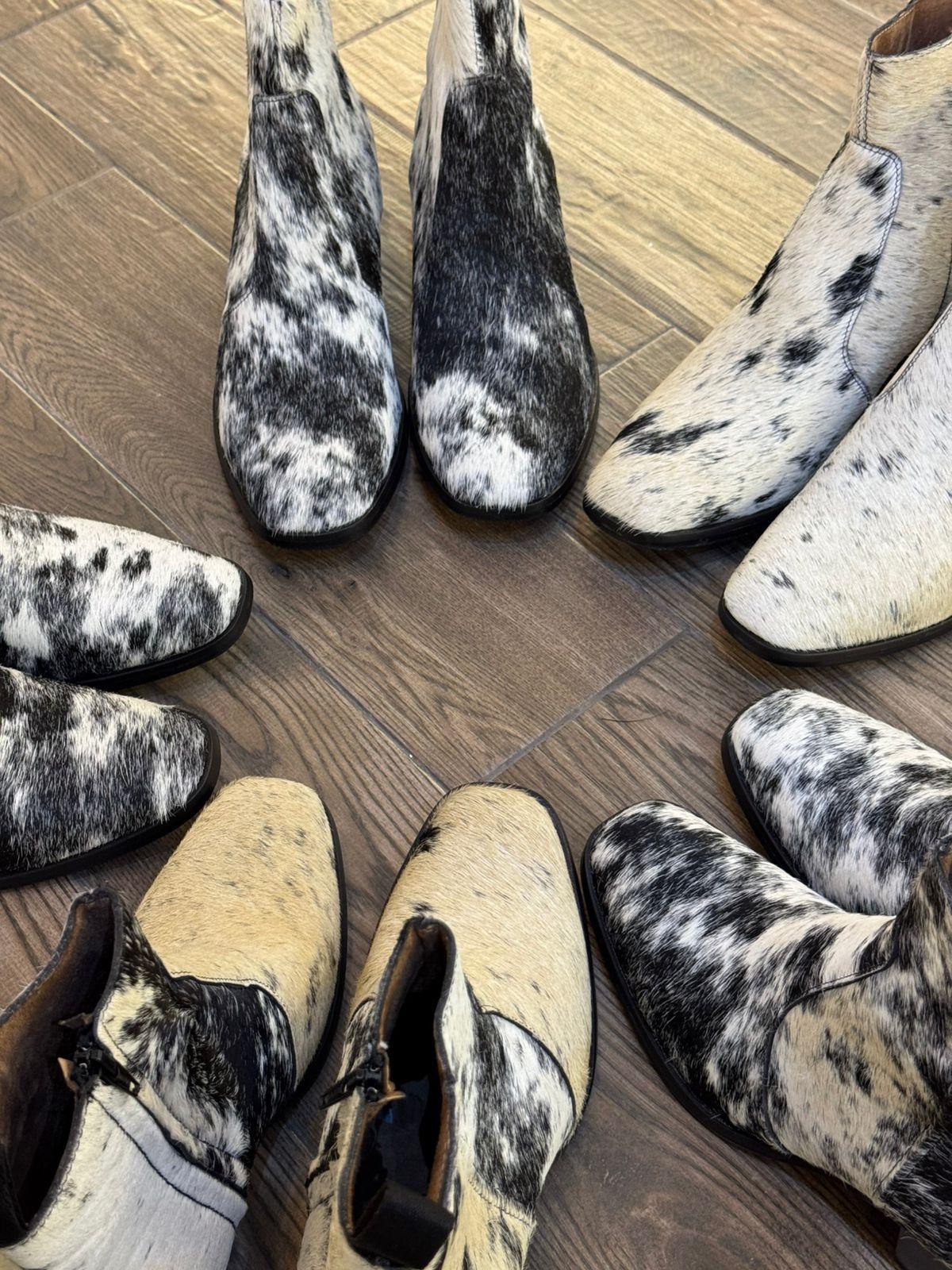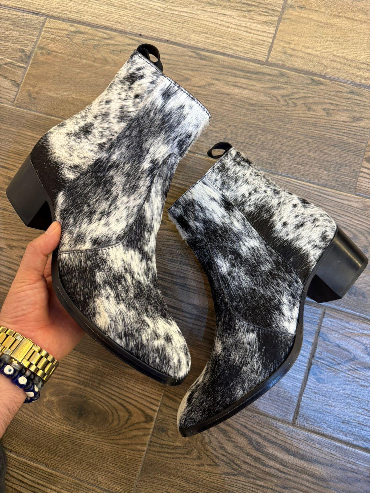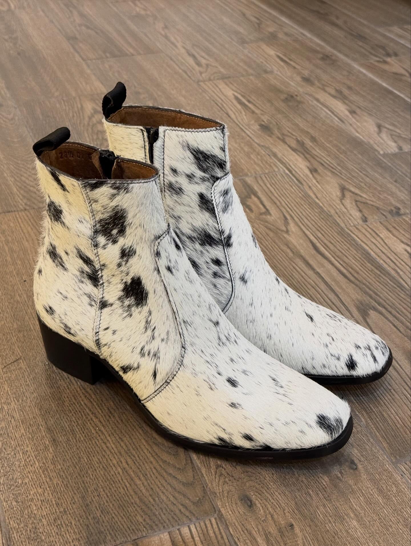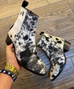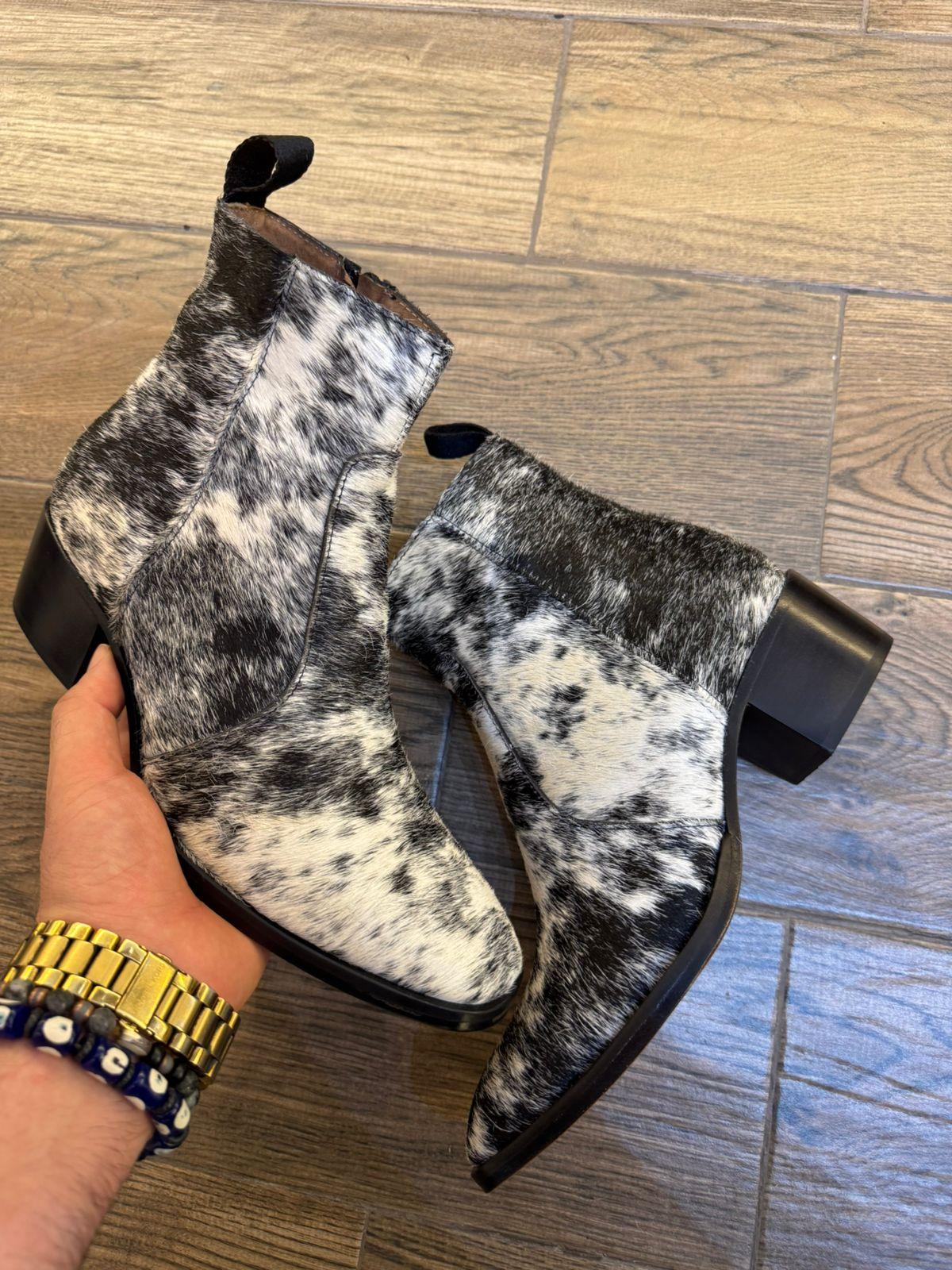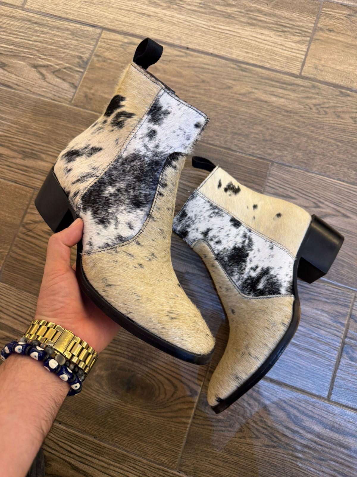Bota elaborada completamente a mano, corte piel de vaca, forro de piel, suela y tacón de cuero natural. El tacón tiene una altura de 5.5 cm.