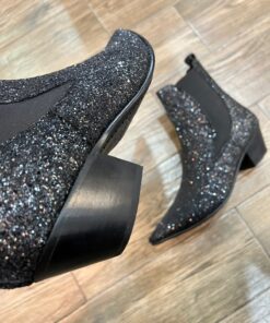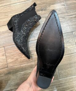 Bota elaborada completamente a mano, corte textil brillos negros, forro de piel, suela y tacón de cuero natural.