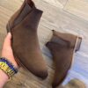 Bota elaborada completamente a mano, corte textil color vino, forro de piel, suela de cuero. El tacón tiene una altura de 5.5 cm.
