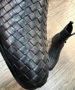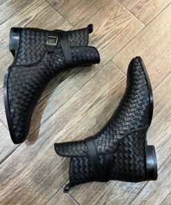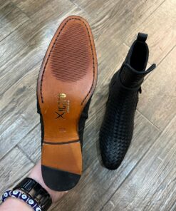 Botín tipo argentino en piel natural color negro, tejido completamente a mano, con forro de piel y suela de cuero.