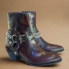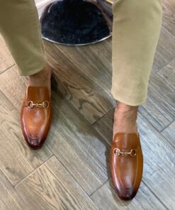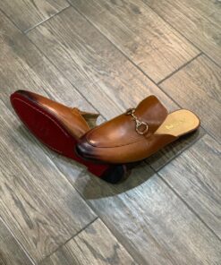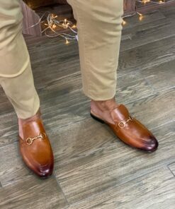 Mule elaborado 100% a mano corte de piel color miel punta café, forro de piel y suela de cuero.