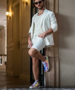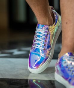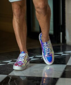 Tenis fabricado completamente de manera artesanal corte sintético tornasol, forro de piel y suela sintética.