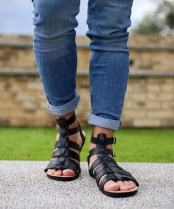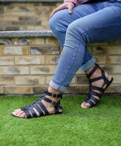 Sandalia tipo Romana piel color negro, suela de cuero. Con 2 hebillas de corte al tobillo.