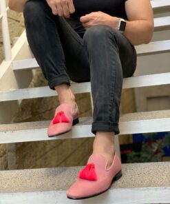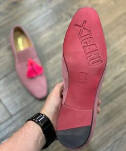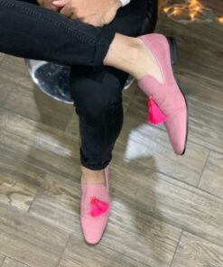 Calzado elaborado 100% a mano corte terciopelo color rosa con motas, forro de piel y suela de cuero.