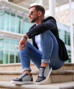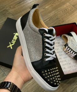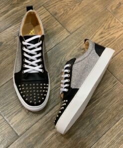 Tenis fabricado completamente de manera artesanal corte piel color negro con estoperoles níquel, textil brillos plata  y suela sintética cosida y pegada.