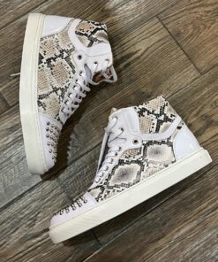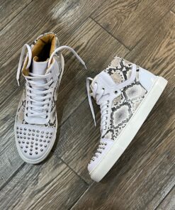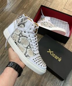 Tenis tipo botín fabricado completamente de manera artesanal corte piel blanco, sintético grabado víbora color beige con estoperoles níquel y suela sintética.