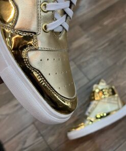 Tenis tipo botín fabricado completamente de manera artesanal corte piel color oro, látigo charol oro con estoperoles y suela sintética.