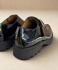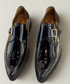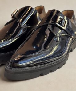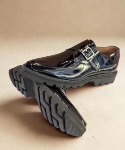 Calzado elaborado 100% a mano corte charol negro, forro de piel y suela sintética ultraligera.